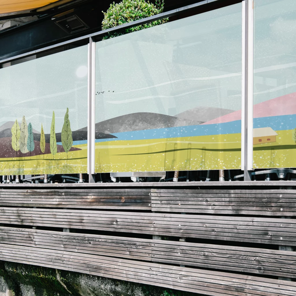 材質表面可依需求加工上亮膜或霧膜。亮膜提升表面光澤感,使色彩更鮮明;霧膜則可減少反光、穩定視覺效果,提升圖像在不同光源條件下的可讀性。印刷畫面整體表現自然清晰,能呈現色塊、圖案與文字內容的細節。特別適合貼附在光滑面上,如壓克力、玻璃、金屬板等。其半透光特性在早晚光線變化下仍能維持穩定能見度,減少出現畫面忽明忽暗的落差,適合室內外視覺應用需求。