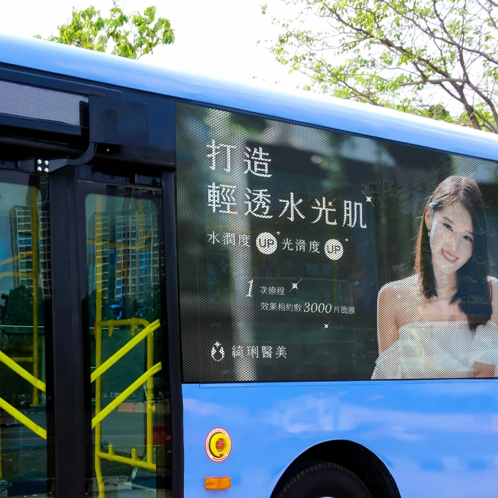 洞洞貼/透視貼在應用上非常多元。以車體廣告為例,乘客從車內往外看,視野不會被阻擋,而路邊行人則只會看到廣告內容,無法輕易看清車內狀況。在大樓或店面櫥窗上貼附,也同樣可以讓內部人員正常看到外部,但外部行人則被廣告畫面所覆蓋,兼顧視覺傳遞與隱私維護。