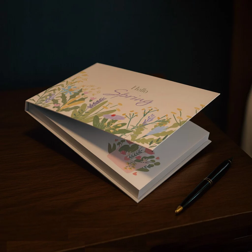 封面使用亮膜加工後貼合厚紙板,不僅增添外觀質感,也提升整體耐用性。表面經處理後略帶光澤,可強化設計圖樣與印刷色彩的呈現力。封面可客製化印刷,無論是企業標誌、品牌識別或活動主題設計,都能清楚顯示,提升專業印象與識別度。